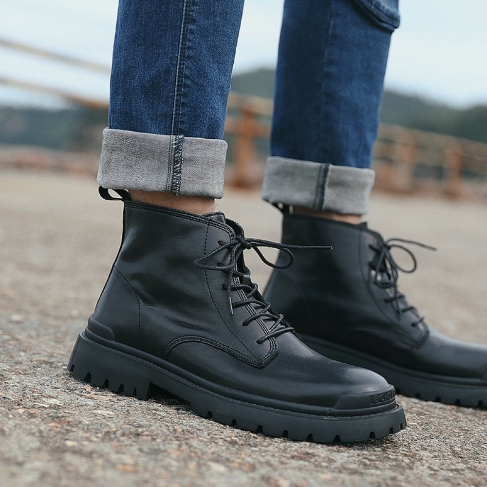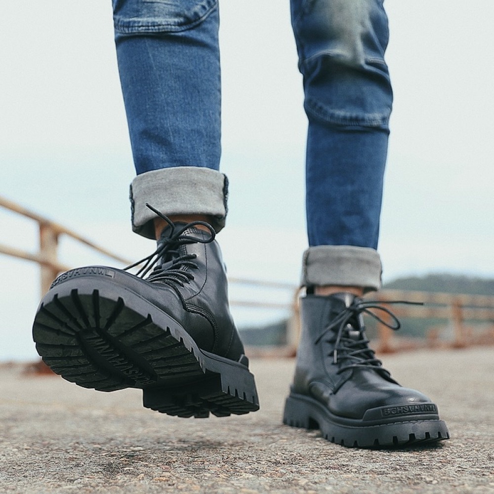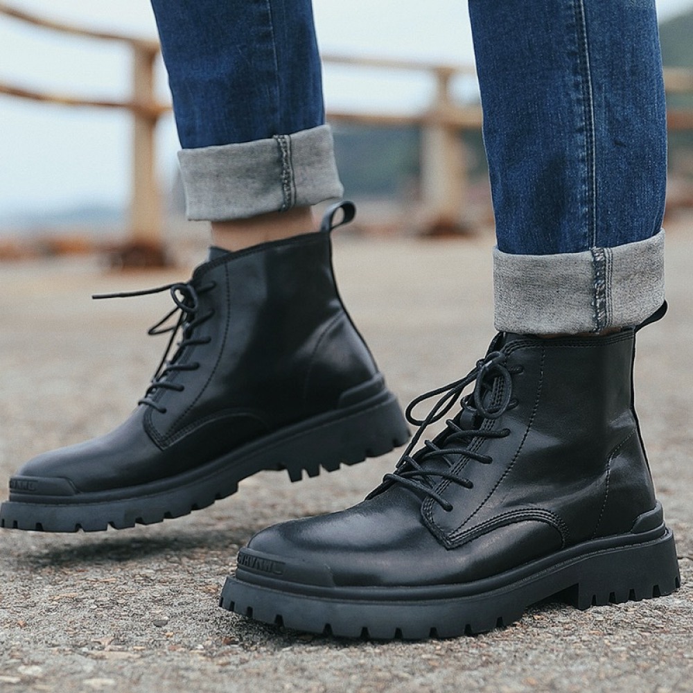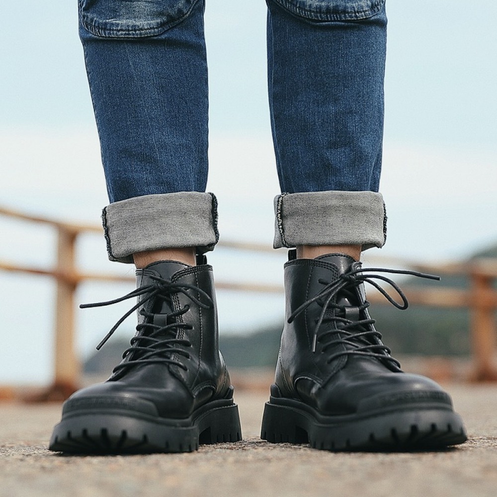 Black Martin Boots Men's Leather Mid-Top Leather Boots High-Top Casual Mens Shoes Increased